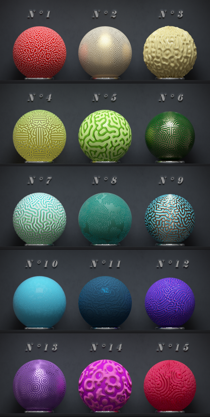 This pack contains 15 Reaction Diffusion Maps to be used for 3D or 2D.